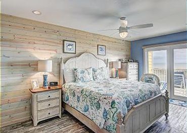 The master bedroom has a new king bed with farmhouse coastal furniture while the two guest bedrooms have queen beds with new mattresses and coastal furniture.